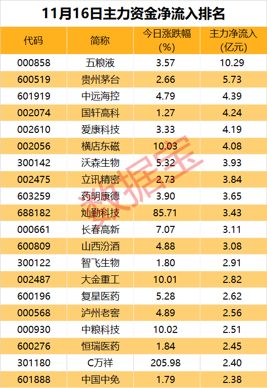 五粮液的主力资金净流入额最多,获加仓10.29亿元。今日盘面上呈现“喝酒吃药”行情,白酒板块一马当先,指数一度大涨超5%。贵州茅台、五粮液成交额双双放大,突破50亿元。盘中贵州茅台市值涨逾700亿元,五粮液市值涨逾330亿元。截至收盘,贵州茅台上涨2.66%,重新站上1800元上方。消息面上,天猫渠道数据显示,从2021年11月1日至11日,茅台、五粮液与壹玖壹玖官方旗舰店、五粮液官方旗舰店进入亿级俱乐部,山西汾酒、洋河、泸州老窖、舍得等均进入千万级俱乐部。