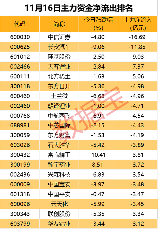 主力资金净流出超亿元的共有138股,中信证券、长安汽车、隆基股份的主力净流出规模居前,分别流出16.69亿元、11.85亿元、9.03亿元。