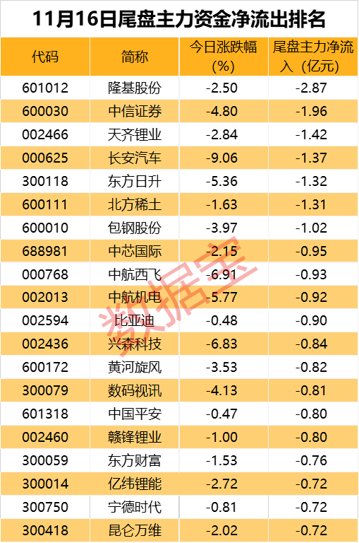 隆基股份的尾盘主力资金净流出额最大,为2.87亿元。中信证券次之,尾盘资金净流出1.96亿元;中信证券今日低开低走,午后跌近5%。中信证券昨日晚间发布公告称,2021年11月15日,中国证监会发审委对公司A股配股的申请进行了审核。根据会议审核结果,公司本次A股配股的申请获得审核通过。中信证券表示,募集资金净额拟全部用于发展资本中介业务、增加对子公司的投入、加强信息系统建设以及补充其他营运资金。其中,发展资本中介业务部分占大头,拟使用资金不超过190亿元。