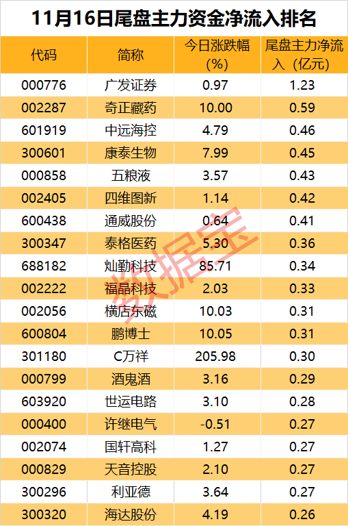 广发证券是今日A股中唯一获得尾盘资金净流入超亿元的个股。(数据宝 郭洁)