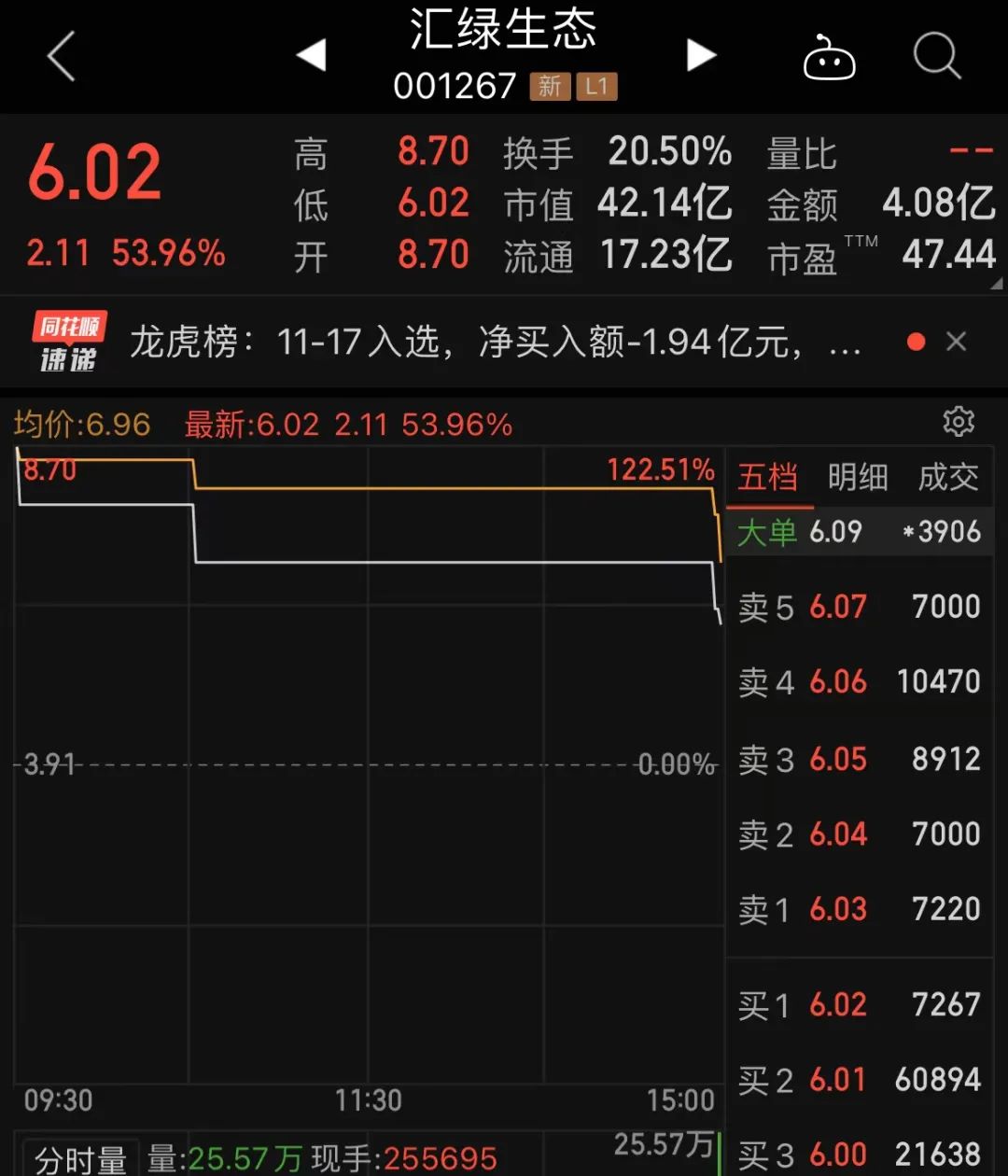 11月17日,汇绿生态时隔16年重新回归A股。根据重新上市首日交易机制,公司股票今日不设涨跌幅限制。早间开盘,汇绿生态大涨122.51%。随后公司股价快速下行,盘中触发两次临停,截至收盘涨幅为53.96%。