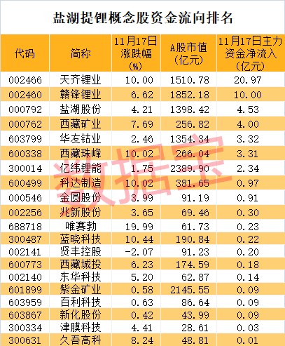 在西藏珠峰的带动下,盐湖提锂概念股如唯赛勃、科达制造、天齐锂业跟风涨停,久吾高科、蓝晓科技、西藏矿业、赣锋锂业等涨幅超5%。