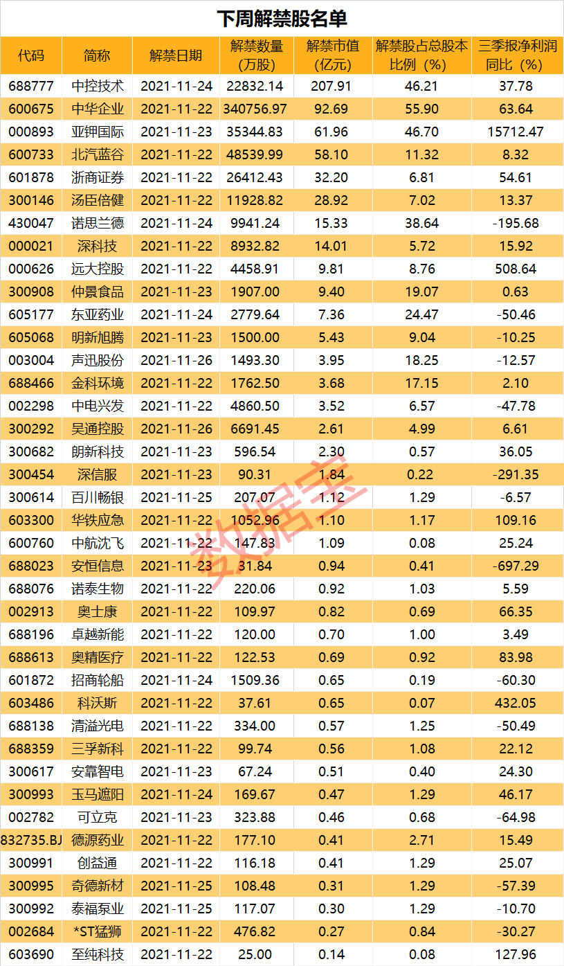 解禁市值规模最大的是工业自动化龙头中控技术,下周将有2.28亿股上市流通,主要是首发原股东限售股份,解禁市值达207.91亿元。中华企业、亚钾国际、北汽蓝谷、浙商证券、汤臣倍健的解禁市值居前。