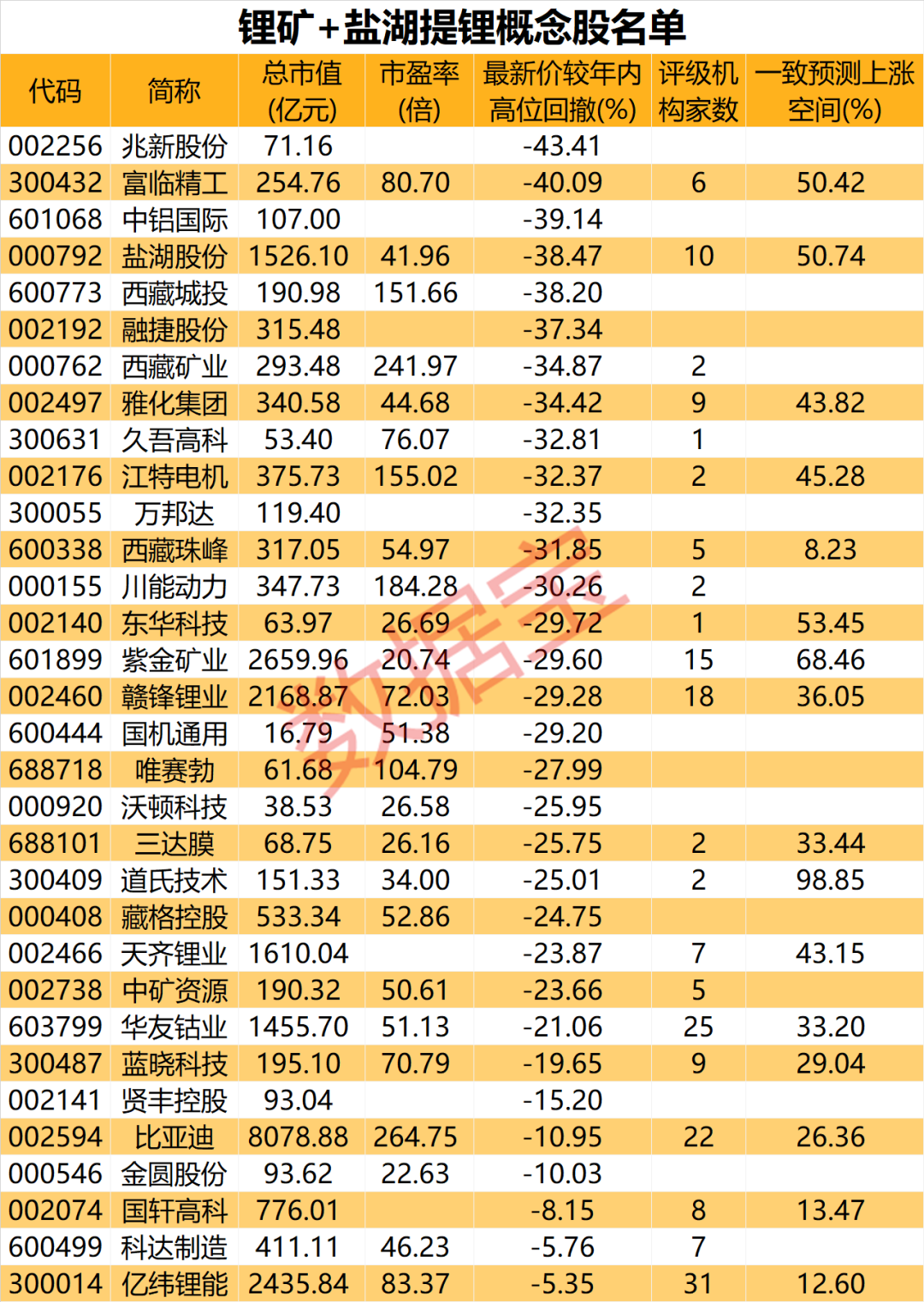 数据宝整理了A股锂矿及盐湖提锂概念股名单。受行业景气波动影响,大多数概念股前期都经历了较大幅度回调,32股平均回撤幅度即有26.77%。其中,兆新股份、富临精工回撤居前,均逾40%;另有中铝国际、盐湖股份、西藏城投、融捷股份等11股回撤30%以上。