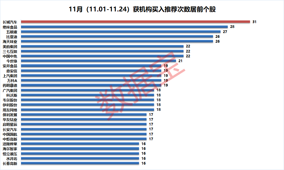 细分至个股,30股获15家以上机构“买入”评级,前5席均属于汽车或食品饮料板块。其中,长城汽车获机构力荐,评级机构家数达31家;绝味食品、五粮液、比亚迪、海天味业紧随其后,评级机构家数分别为28家、27家、26家、26家。与此同时,美的集团、三七互娱、中国中免、今世缘11月以来也获得较多机构推荐,评级机构均逾20家。