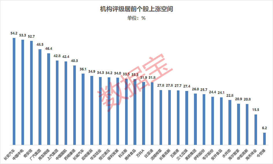 数据宝统计显示,在获15家以上机构“买入”评级的30只个股中,28股机构预测上涨空间逾20%。长安汽车、中国中免、奇安信上涨空间居前,分别为54.2%、53.3%和52.7%;受广州国际车展利好影响,其后广汽集团、上汽集团、长城汽车上涨空间均在35%以上。