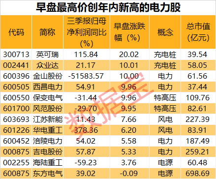 “双碳”目标确定后,电力股自今年下半年以来一直是资金的宠儿,下半年电力股保持上涨趋势,今日多股冲击年内高点。证券时报·数据宝统计,早盘共有12只电力股股价冲击年内最高点,英可瑞、众业达、金山股份、西昌电力、保变电气、风范股份早盘均涨停。