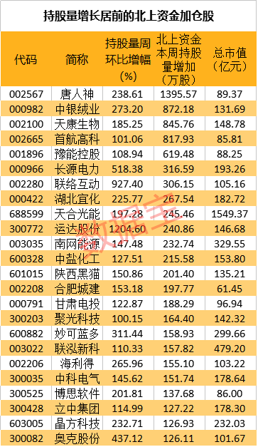 数据宝统计显示,增仓幅度来看,本周持股数环比增幅在100%以上的共有51只,从增持股数来看,唐人神获北上资金增持量最高,为1395.57万股,其他增持股数居前的还有中银绒业、天康生物、首航高科。