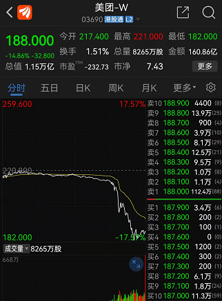 2月18日,港股美团-W股价午后跳水,盘中跌幅一度超17%,收盘大跌14.86%,报188港元/股,市值蒸发逾2000亿港币,收报1.15万亿港币。