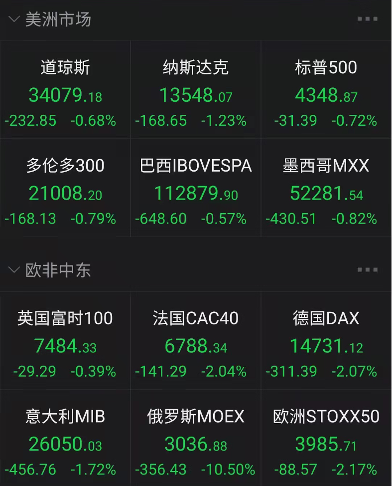 欧美其他地区最新收盘同样集体飘绿,主要股指全部下跌。欧洲市场中,德国DEX指数、法国CAC40指数、荷兰AEX指数均下跌2%以上;上周五美股三大股指微跌,纳指下跌1.23%,道指、标普500跌幅控制在1%以内。