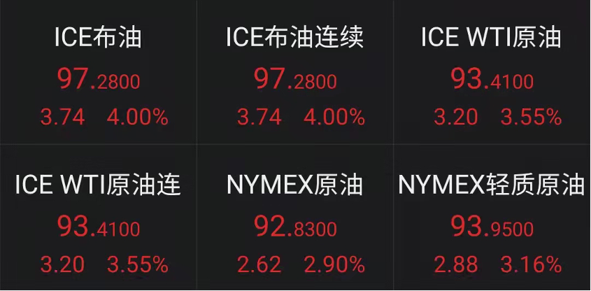 股市受挫的同时,国际油价集体走高,布油、WTI原油均上涨3%以上,尾盘布伦特原油期货一度破97美元/桶,创下近七年历史新高,NYMEX原油上涨2.9%。