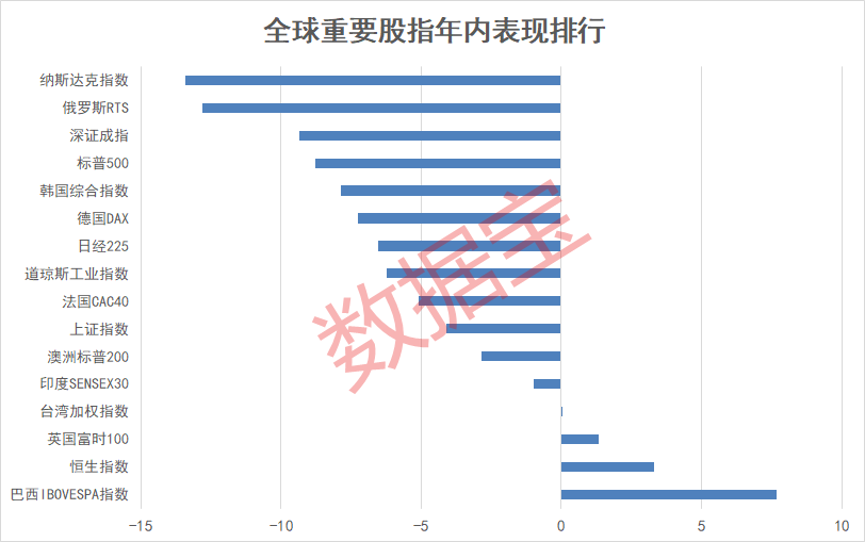 2022年开年以来,全球重要股指均呈下跌态势。证券时报·数据宝统计,年初至今重要股指平均下跌4.55%,其中俄罗斯RTS、纳斯达克指数均下跌10%以上,德国DAX、韩国综合指数、标普500等7个市场股指下跌5%以上;去年跌幅最大的恒生指数今年以来表现较好,上涨3.3%排行第二。