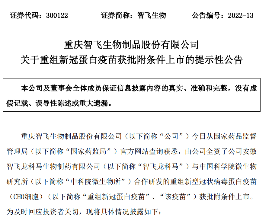 智飞生物晚间发布公告表示,重组新冠蛋白疫苗是首个获批的重组新冠病毒蛋白疫苗,适用于预防新型冠状病毒感染所致的疾病(COVID-19)。公司将持续做好该疫苗产品保质保量生产、供应等工作,若后续工作进展顺利,将对该疫苗的WHO认证及其作为序贯(异源)加强针免疫接种起到促进作用,对上市公司未来业绩、研发进展、国际化战略推进也将产生一定的积极影响。