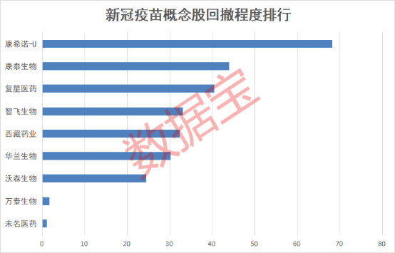 新冠疫苗概念股近半年时间持续回调,统计显示,自去年下半年以来,新冠疫苗概念股平均下跌30.56%,康希诺-U回撤程度接近70%,康泰生物、复星医药等也有明显跌幅。