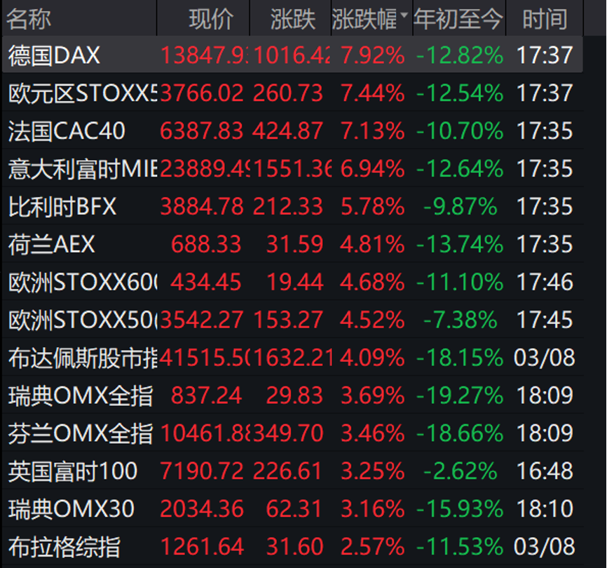 多个欧洲股指涨幅创下近两年最高纪录,德国DAX指数开盘后迅速拉升,飙涨7.92%,法国CAC40指数涨7.13%,荷兰AEX指数、英国富时100、比利时BFX等指数均上涨3%以上。