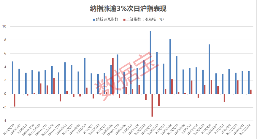 数据宝统计,美股强势上涨时,A股往往在下个交易日也有较好的表现。以纳斯达克指数和上证指数为例,2010年以来,纳斯达克指数共有38次涨幅超过3%,在下个交易日上证指数上涨的概率为58.33%,涨幅超过2%的概率为13.89%,强于沪指的平日表现。