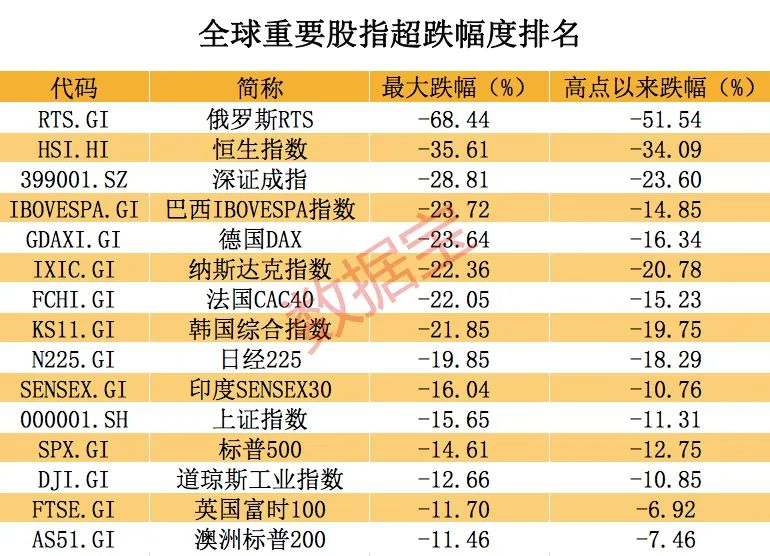 除了俄罗斯股市跌入熊市外,全球重要股指中恒生指数、巴西IBOVESPA指、巴西IBOVESPA指数等8个指数最大跌幅超过20%,恒生指数、纳斯达克指数高点以来跌幅依然超过20%。巴西、德国、法国等国股指跌入技术性熊市后已出现明显反弹。