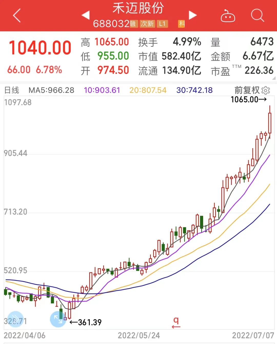 禾迈股份主要从事光伏逆变器等电力变换设备和电气成套设备及相关产品的研发、制造与销售业务。禾迈股份上市后业绩保持增长,2021年公司归母净利润约2.02亿元,同比增长约93.79%;今年一季度,公司归母净利润0.87亿元,同比大增175.23%。公司股价自4月26日创下近362元低点后一路强势反弹,目前较低点已涨近200%。