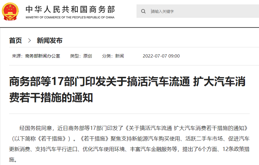 7月7日,商务部等17部门发布《关于搞活汽车流通 扩大汽车消费若干措施的通知》提出,支持新能源汽车购买使用,促进跨区域自由流通,破除新能源汽车市场地方保护,各地区不得设定本地新能源汽车车型备案目录,不得对新能源汽车产品销售及消费补贴设定不合理车辆参数指标。