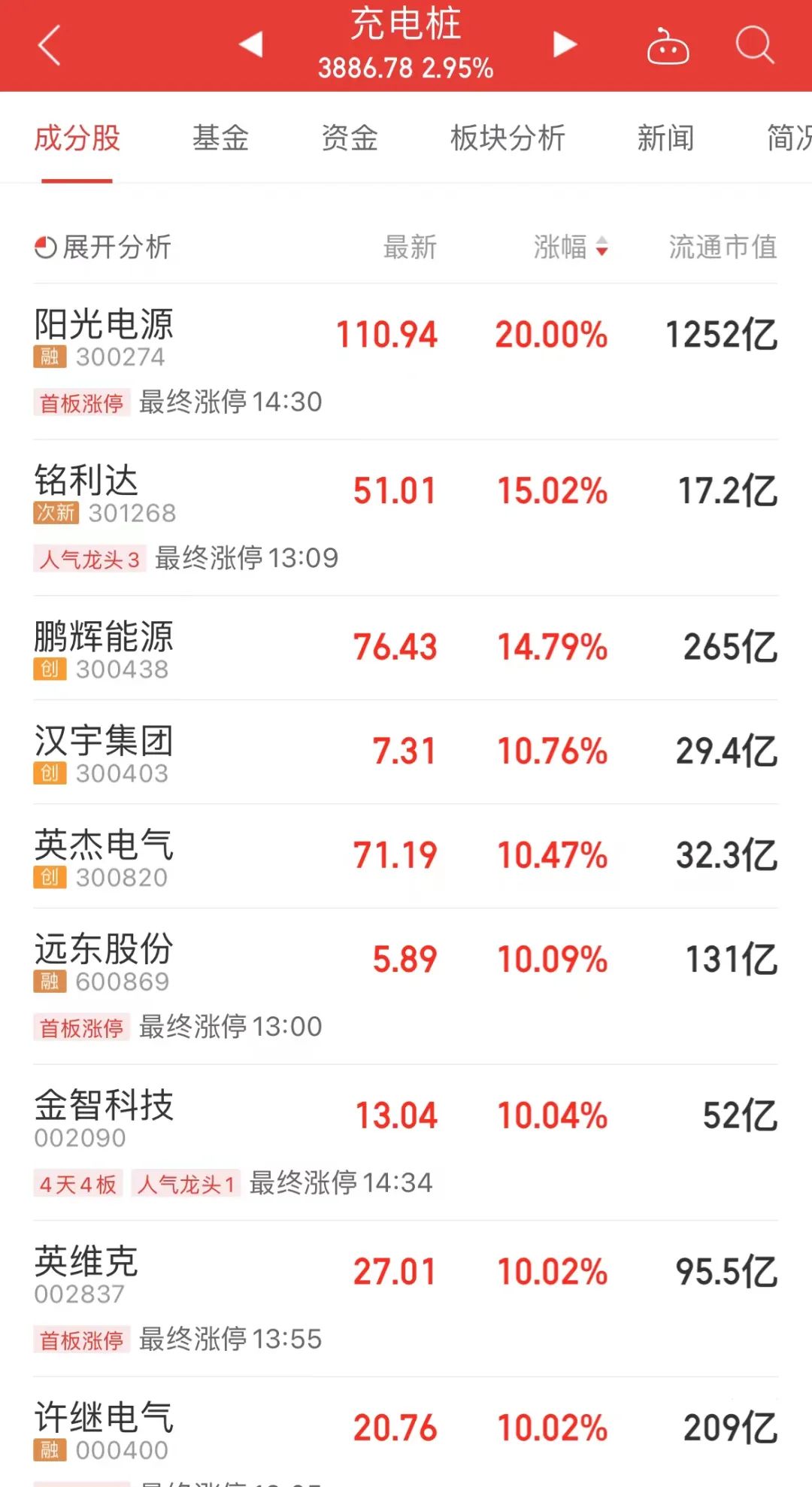 今日充电桩板块表现强势,概念指数大涨4%,金智科技4连板,阳光电源、远东股份、许继电气等多股涨停。