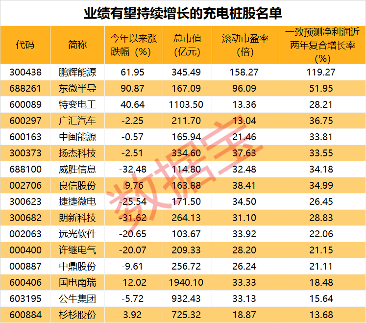 证券时报·数据宝统计,涉及充电桩的概念股数量多达上百只,市值超千亿的有国电南瑞、阳光电源、特变电工。