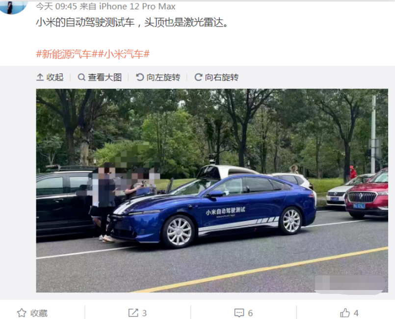 小米汽车又有了最新进展。据科技媒体报道,今日有汽车博主首次曝光了一张小米自动驾驶测试车辆的照片。照片显示小米自动驾驶测试车在车顶配有激光雷达。据悉,这是小米宣布造车以来,首次在网络上出现相关图片。