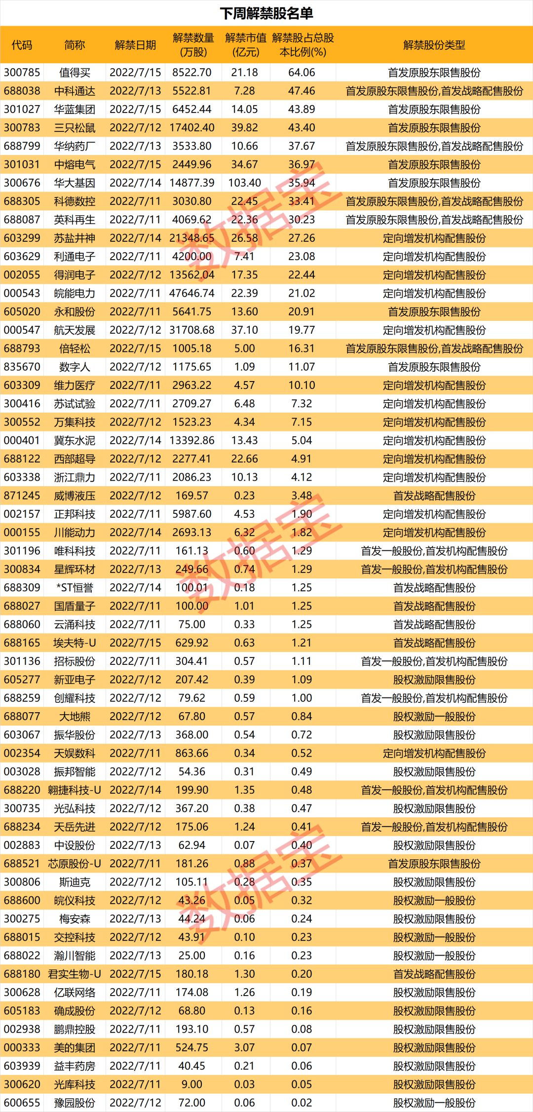 从流通盘增量来看,解禁后,中科通达流通盘将大幅增加223.33%;值得买、华纳药厂、华蓝集团、科德数控、中熔电气和英科再生流通盘增加也将超过140%。