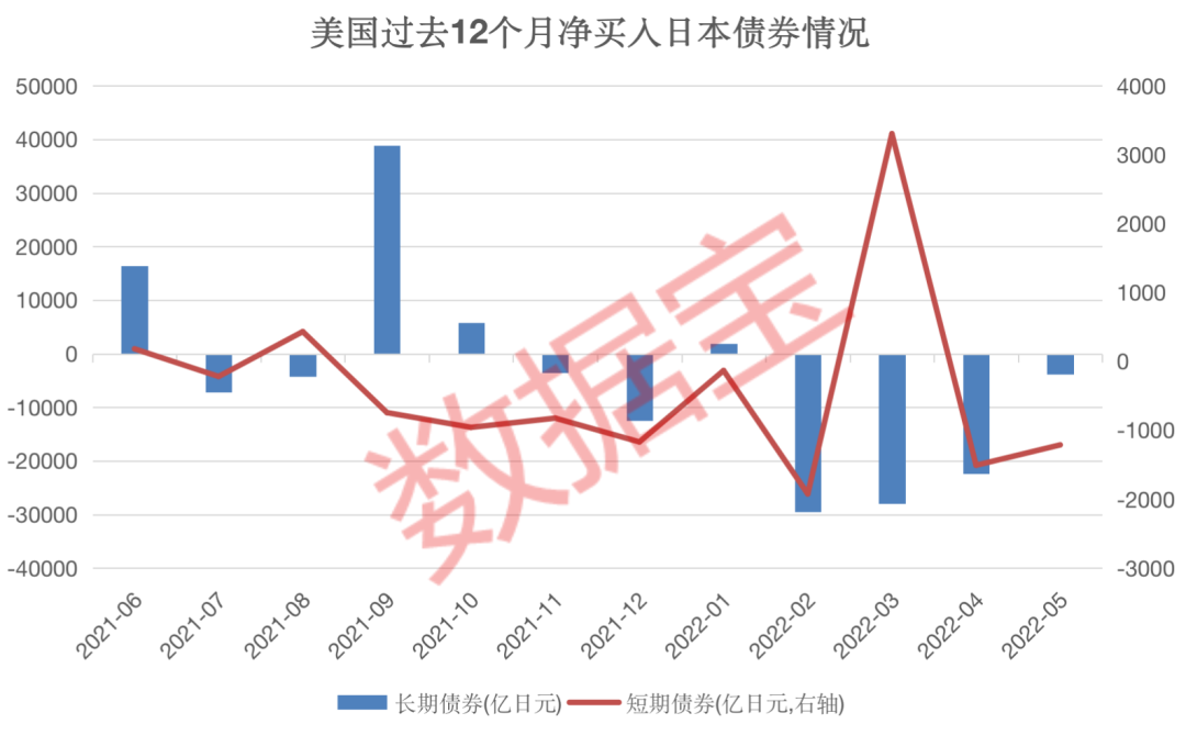 日本央行数据显示,今年2月份以来,截至5月份,美国连续4个月净减持日本长期债券,合计8.36万亿日元,其中2月份净减持2.95万亿日元,创下2018年3月份以来最高水平;2月至5月净减持短期债券合计1343.15亿日元。