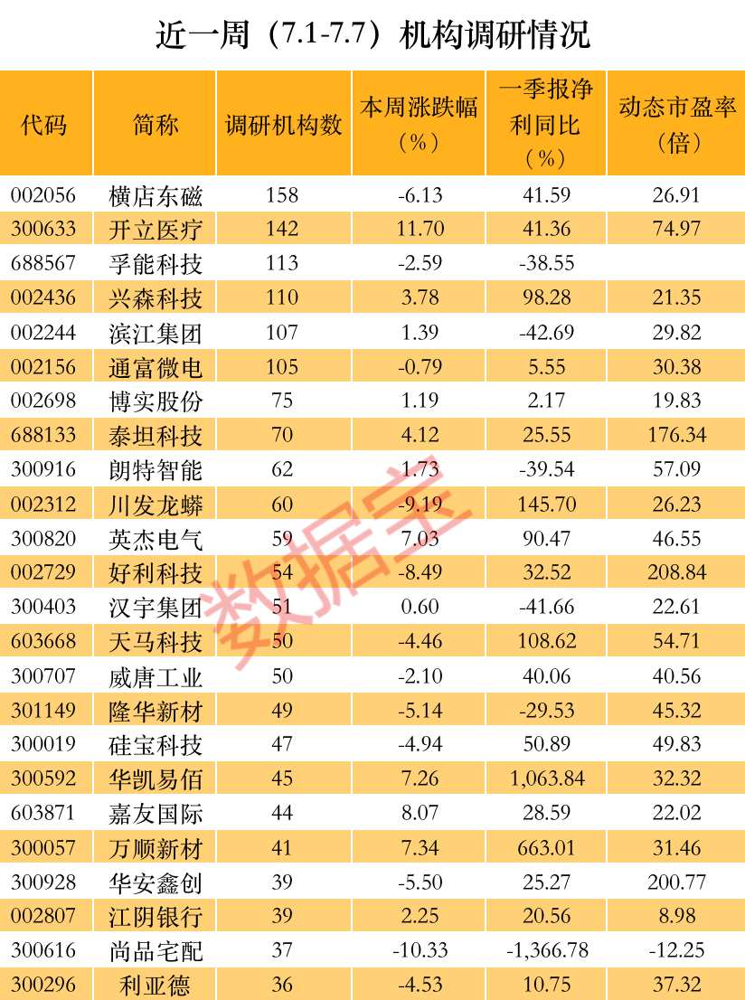 横店东磁为近一周调研机构数量最多股票