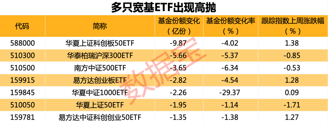 一些跟踪宽基指数的ETF出现高抛现象,份额减少明显。科创50、创业板指和科创创业50上周分别上涨1.38%、1.28%和1.27%,而科创50ETF、沪深300ETF、中证500ETF、创业板ETF份额分别减少9.87亿份、5.66亿份、3.65亿份和2.82亿份。