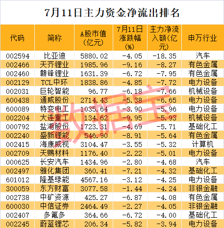 单只股票来看,144股主力资金净流出逾亿元。比亚迪、天齐锂业、赣锋锂业、TCL中环、巨轮智能等主力资金净流出额排在前五位。新能源车龙头比亚迪净流出额18.35亿元排在第一位,该股今日下跌4.06%。