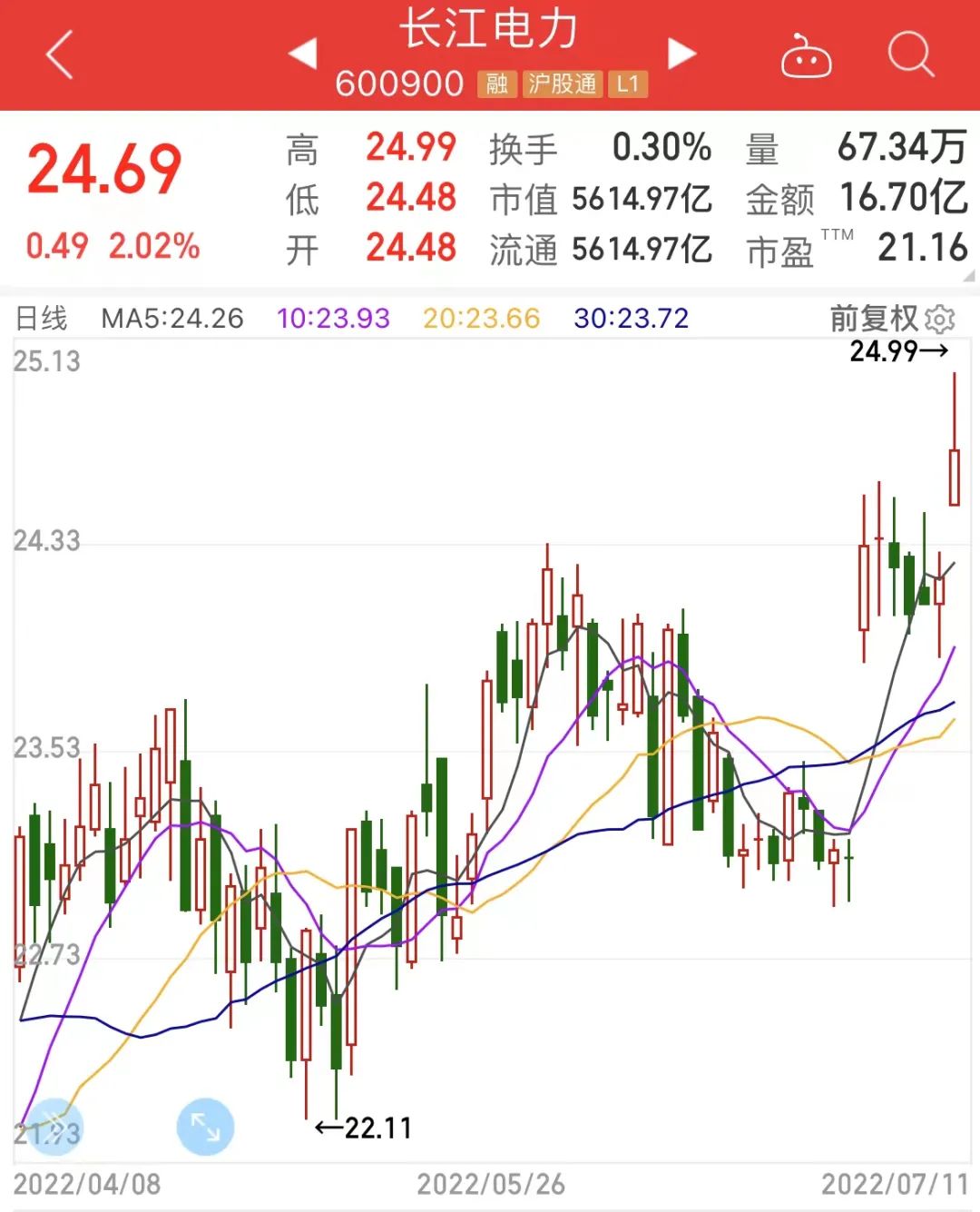 消息面上,受益于来水的显著改善,我国水电发电情况优异。周末,长江电力公告称长江上游溪洛渡水库来水总量约509.70亿立方米,较上年同期偏丰74.43%,三峡水库来水总量约1772.79亿立方米,较上年同期偏丰27.47%。长江电力公布第二季度发电量约611亿千瓦时,同比增长53%。该股今日盘中股价涨至最高24.99元/股,刷新历史高点。