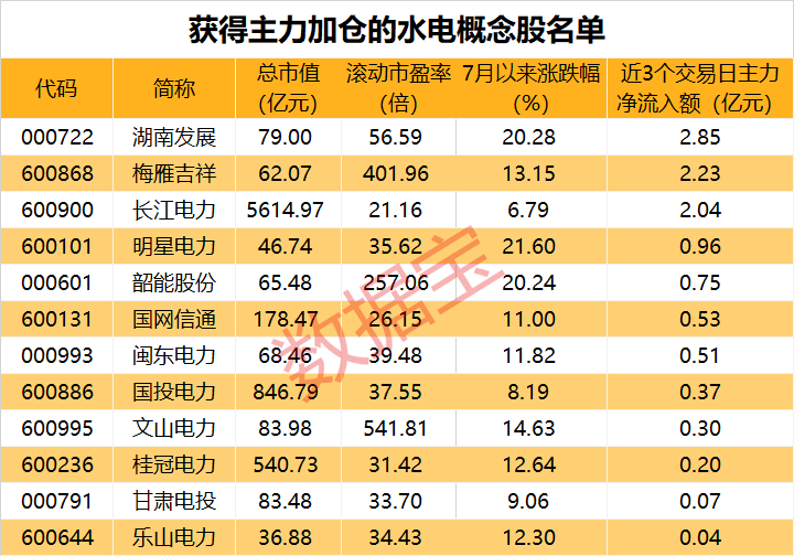 近3个交易日,12股获得主力资金加仓,其中湖南发展、梅雁吉祥、长江电力的累计净流入额均超2亿元;长江电力、华能水电、川投能源等7股7月以来获得北上资金加仓。