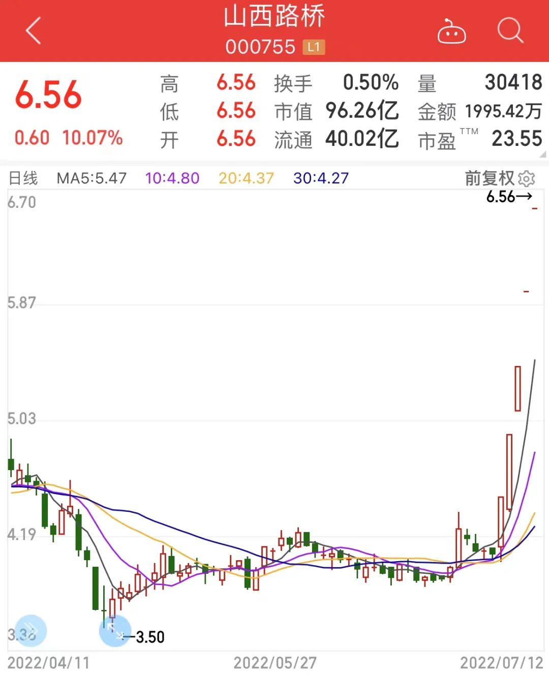 山西路桥累计涨幅最高,今日再度涨停,目前连续收获5个涨停板,4月27日至今累计上涨79.73%,最新收盘价创四年来新高。