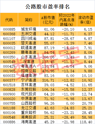 数据宝统计,截至7月12日收盘,近半数公路股滚动市盈率不足10倍,如城发环境、五洲交通、四川成渝、楚天高速、赣粤高速等。