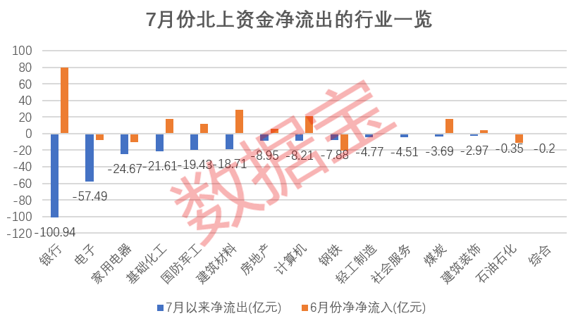 数据宝统计,7月份以来共有16个行业呈净流出状态,其中6个行业净卖出额超10亿元,银行板块净卖出额居首,超过百亿;值得一提的是,6月份该板块获北上资金合计净买入金额近80亿元,7月份以来受消息面影响,银行股遭重挫,市值合计蒸发超7000亿元,指数月内下跌超过4.5%。此外, 房地产板块遭北上资金净卖出金额近9亿元。
