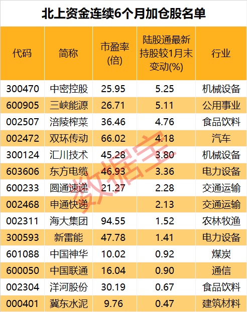 这些股连续6个月获北上资金加仓