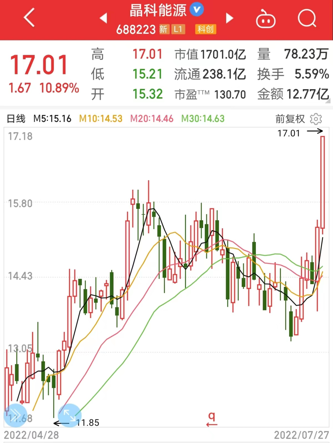 7月27日,光伏组件龙头之一晶科能源大涨10.89%,收盘价创下历史新高,A股市值突破1700亿元。自今年1月26日上市以来,该公司股价震荡上行,最新收盘价与发行价相比,累计涨幅达到2.4倍。