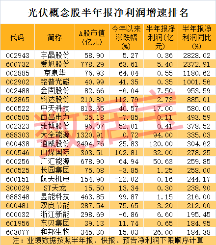 从业绩数据来看,光伏产业链整体亮点不少。数据宝统计,已公布半年报、快报和预告净利润下限数据的公司中,超六成净利润为增长状态。市值超千亿以上的龙头公司中,比亚迪、通威股份、晶澳科技、大全能源净利润预计翻倍增长。