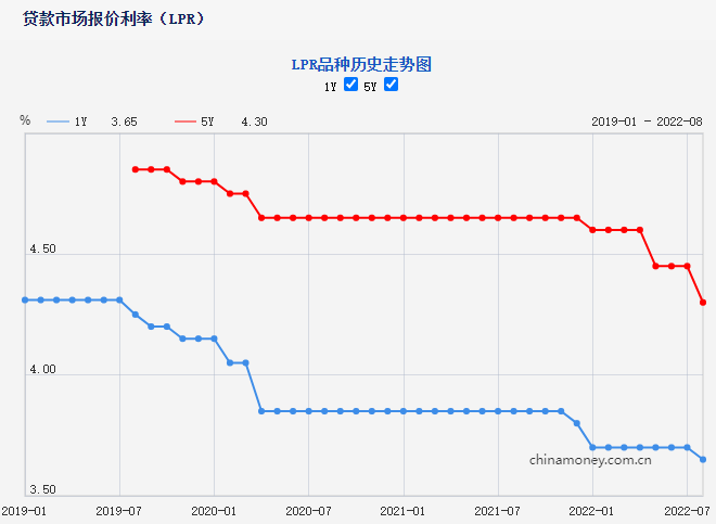 今日,中国人民银行授权全国银行间同业拆借中心公布,2022年8月22日贷款市场报价利率(LPR)为:1年期LPR为3.65%,前值为3.7%;5年期以上LPR为4.3%,较前值4.45%下调15个基点。