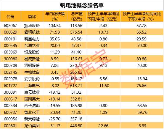 证券时报·数据宝统计,A股中布局钒电池的概念股有16只;其中,振华股份年内累计上涨104.54%,涨幅居首。攀钢钒钛、明星电力、金浦钛业年内累计上涨幅度均超20%。