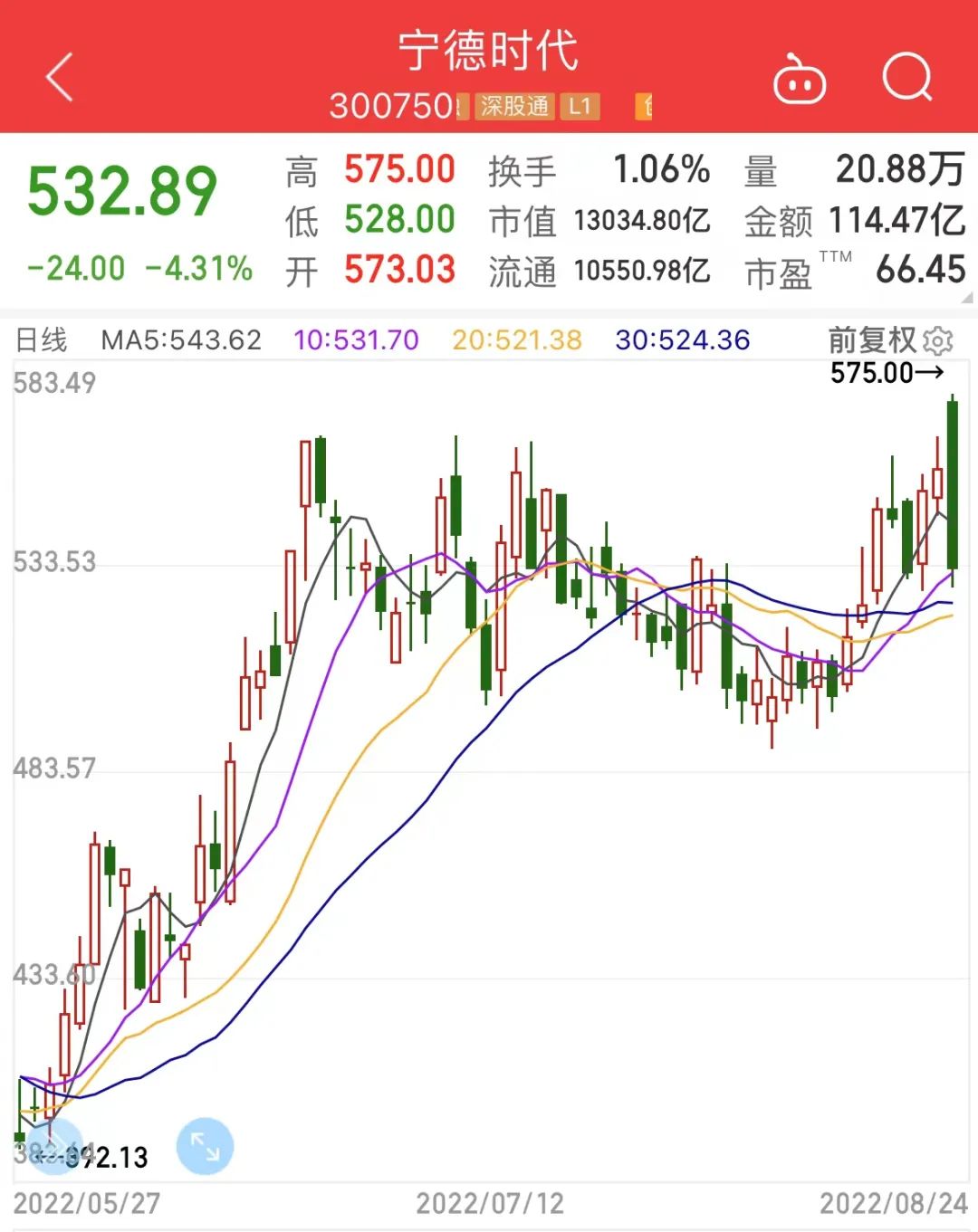 在上述消息影响下,今天早盘宁德时代高开2.9%。截至上午收盘,宁德时代大跌近5%。整个电池板块早盘集体大跌,震裕科技、紫建电子、中国宝安等个股跌逾5%。