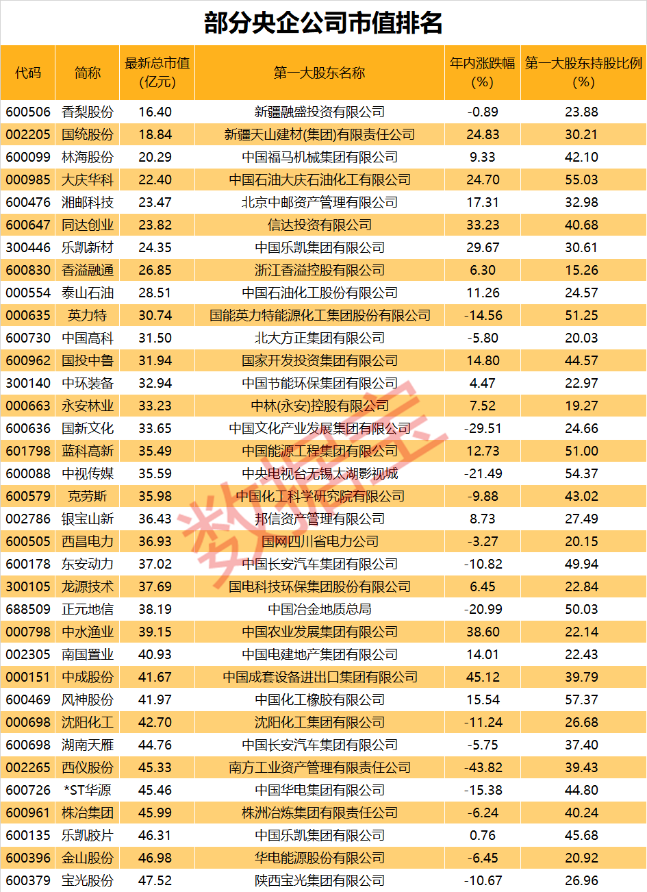 数据宝统计,最新市值在50亿元以下、机构评级空缺且去年每股收益低于0.2元的央企公司,合计共有36个。