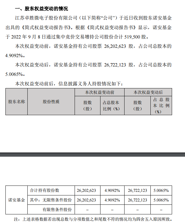 卓胜微9月14日早间公告,诺安成长混合基金9月8日通过集中竞价交易增持公司股份合计51.95万股。此次权益变动后,诺安成长持有公司股票2672.21万股,占公司总股本的5.0065%,达成举牌。相比半年报持股,诺安成长三季度累计增持739万多股。