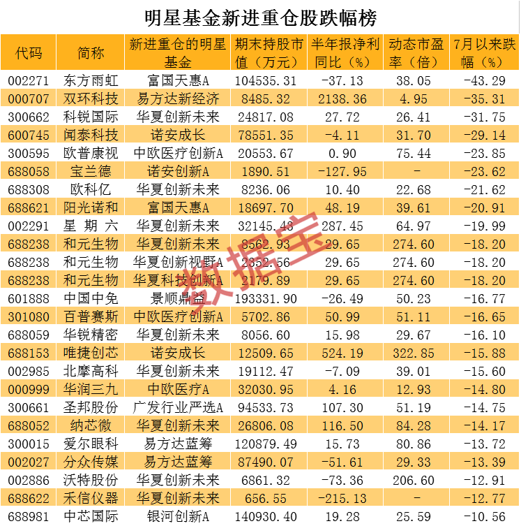包括蔡嵩松、葛兰、刘彦春等明星基金经理,有8只二季度新进重仓股7月以来大跌超20%。