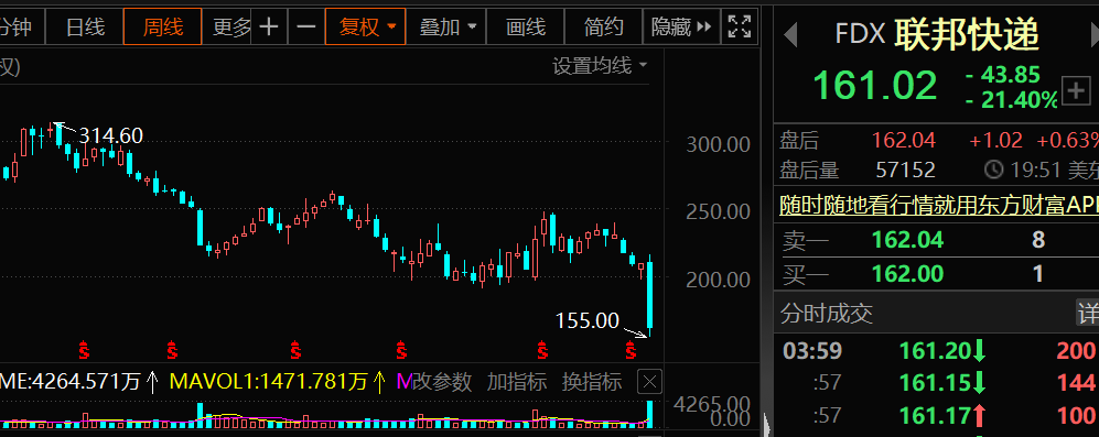联邦快递跌21.4%,日内低点155美元触及2020年7月初以来的两年多最低,也创下公司历史上最大单日跌幅。