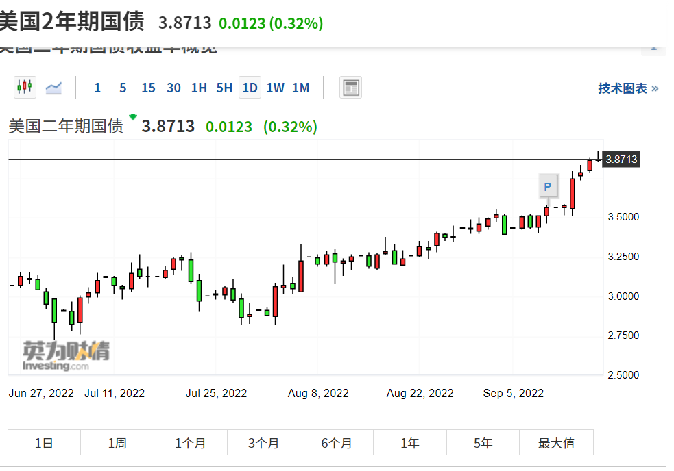 对利率前景敏感的两年期美国国债收益率一度突破3.9%,这是2007年11月1日以来该项收益率首次突破这一水平,创十五年新高。英镑兑美元一度跌破1.14美元,为1985年来首次。由于美元在美联储的加息风暴中势不可挡,英镑兑美元汇率今年以来的跌幅达到16%。
