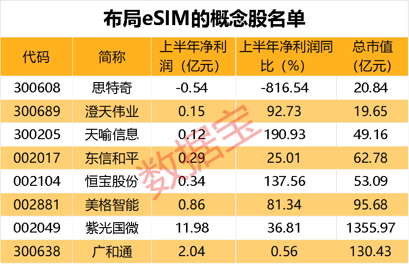 太平洋证券认为,eSIM将大幅降低物联网模组的制造成本和难度,提升模组厂商大规模出货能力,推动物联网应用发展。统计显示,A股中布局eSIM的有8只股票,昨天的交易日中,恒宝股份、东信和平强势涨停。恒宝股份的eSIM卡已实现批量供货。