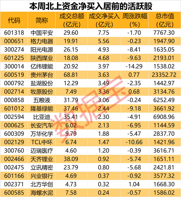 数据宝统计显示,本周共有37股登上北上资金成交活跃榜,其中15股净流入超亿元。从所属行业来看,电气设备、食品饮料股本周成交活跃,合计买卖总额在100亿元以上。化工、家用电器股成交净买入居前,银行、医药生物股具有明显的净流出。