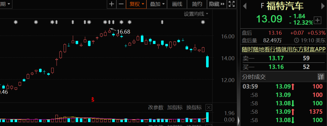 大型科技股多数下跌,亚马逊跌近2%,福特汽车暴跌逾12%,创2011年1月份以来最大单日跌幅,由于通货膨胀和供应链问题,其预计第三季度将产生10亿美元的额外成本。